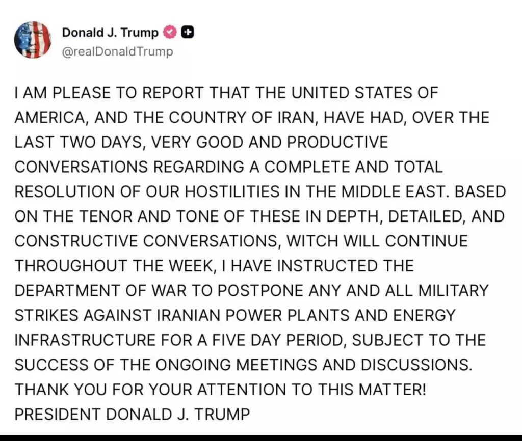 Citing the talks, Trump said he had directed the Pentagon to “postpone any and all military strikes against Iranian power plants and energy infrastructure for a five day period, subject to the success of the ongoing meetings.”He added that the previously undisclosed US-Iran discussions would “continue throughout the week.” The announcement came just ahead of a Monday night ultimatum for Iran to reopen the Strait of Hormuz shipping route or face threats.Earlier on Saturday, Trump had threatened to “obliterate” Iran’s power infrastructure if Tehran failed to reopen the strategically vital Strait of Hormuz, through which nearly a fifth of global oil supply passes.
